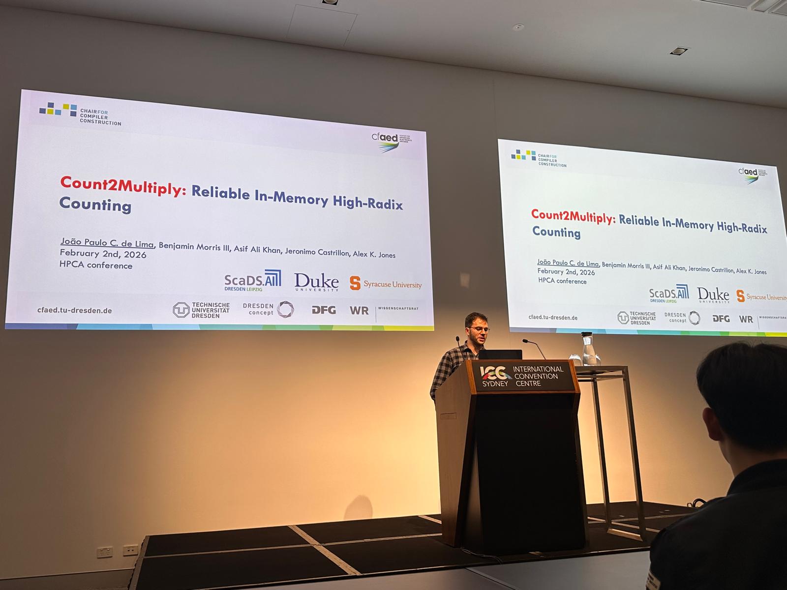 The joint IEEE/ACM HPCA/CGO/PPoPP/CC 2026 conference took place in Sydney, Australia, from Saturday, 31 January to Wednesday, 4 February 2026, bringing together researchers from architecture, compilers, and parallel programming. Our Chair was represented by Prof. Anderson Faustino da Silva, Asif Ali Khan, and João Paulo C. de Lima, who contributed across several co-located venues. At CGO 2026, Anderson Faustino da Silva presented two papers in collaboration with Prof. Fernando Pereira: On the Precision of Dynamic Program Fingerprints Based on Performance Counters and Binary Diffing via Library Signatures. At HPCA 2026, João presented Count2Multiply: Reliable In-Memory High-Radix Counting, the result of a long-standing collaboration with Prof. Alex K. Jones. In addition, João gave an invited talk titled “Fault Injection Framework for Processing-using-Memory Architectures” at MCCSys 2026, the Workshop on Memory-Centric Computing Systems, and Asif presented “Compilation for Heterogeneous Near-Memory and In-Memory Computing Architectures” at LATHC 2026, the Workshop on Languages, Tools, and Compilers for Heterogeneous Computing.