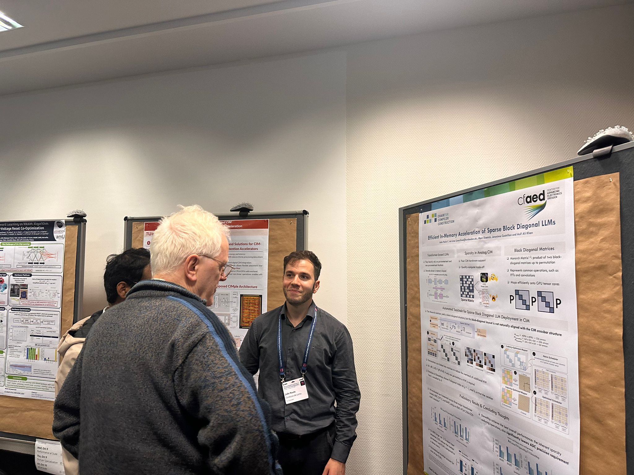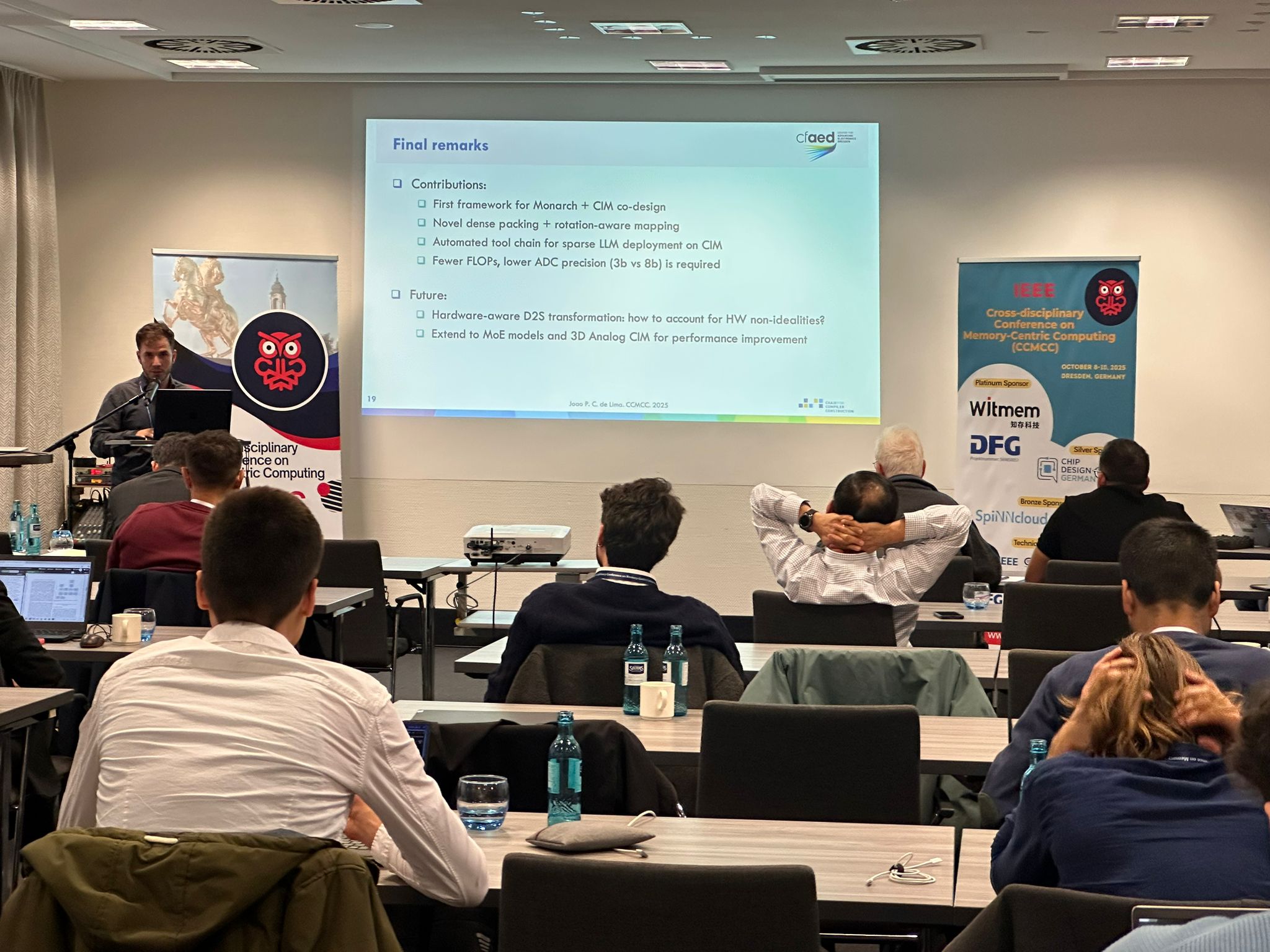 The Chair for Compiler Construction hosted the first IEEE Cross-disciplinary Conference on Memory-Centric Computing (CCMCC), held on October 8-10, 2025, in Dresden. Our group was represented by Prof. Jeronimo Castrillon, Asif Ali Khan, Joao Paulo Cardoso de Lima, Anderson Faustino da Silva, Robert Khasanov, and Alexander Kusnezoff, with valuable organizational support from Christina Norkus and Conny Okuma. It was a pleasure to contribute to the event as part of the organizing team, serving as Local Organizing Chair and Finance Chair. During the CCMCC, Joao Paulo presented our paper titled "Efficient In-Memory Acceleration of Sparse Block Diagonal LLMs". The work introduces an automated framework with novel mapping and scheduling strategies to accelerate sparse LLM inference on compute-in-memory accelerators by exploiting block-diagonal sparsity.