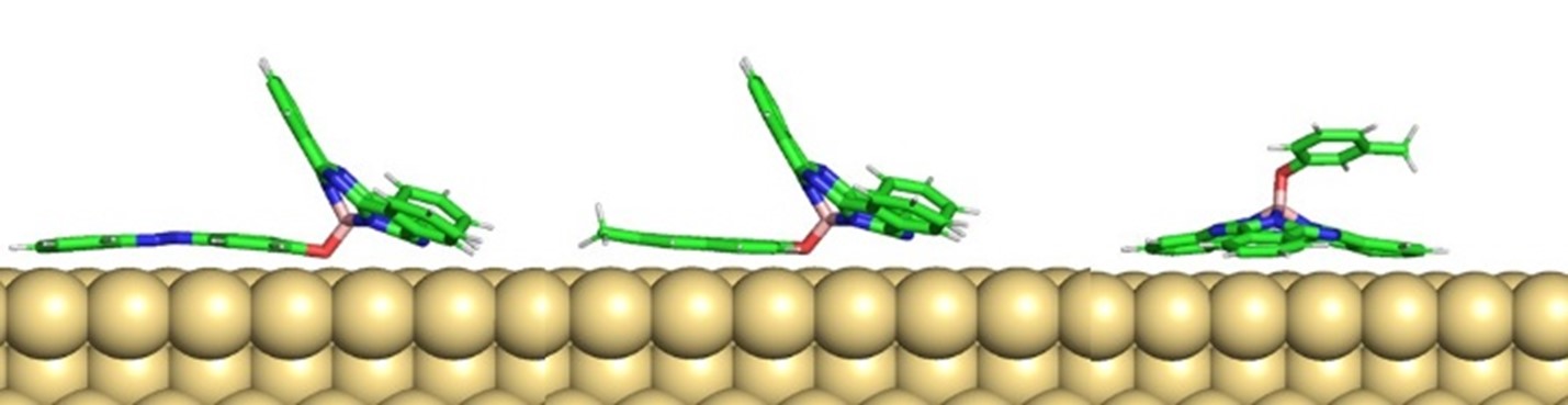 Scientists of TU Dresden, TU Hamburg-Harburg, and IPF Dresden have functionalized subphthalocyanine with a series of vertical axial ligands of varying conjugation lengths and studied their adsorption on the Au(111) surface by low-temperature STM supported by simulations. They found that increasing the conjugation length of the axial ligand induces a distinct transition in the adsorption geometry.