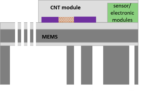 An inevitable evolutionary step for nanodevice technology is the combination with peripheral or any functional environment such as circuitries, energy management, signal processing or System-on-a-Chip. This task involves huge challenges on microtechnological processing and compatibility with typical device technologies. In this frame, we develop heterogeneous technologies for integration of nanomaterials such as CNT-based sensors in MEMS, MOEMS or ASICs.