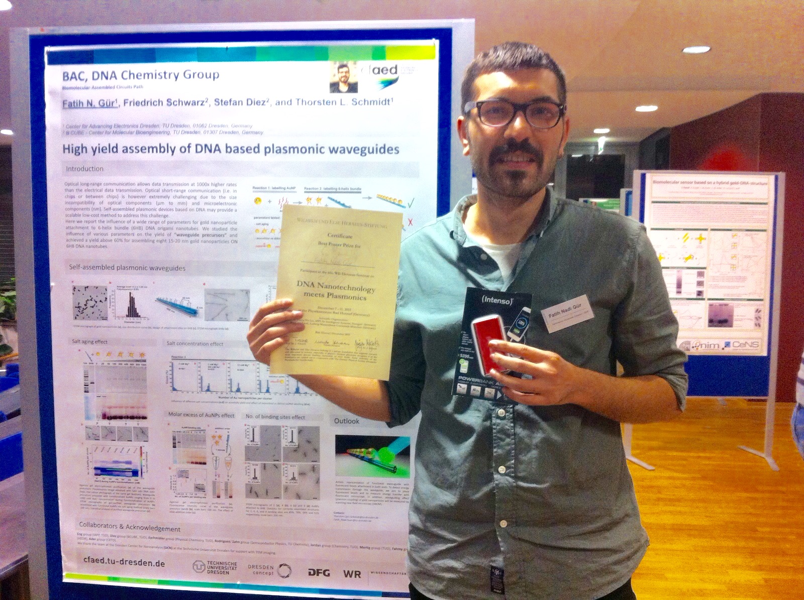 Fatih Gür (Schmidt lab) wins the poster prize at "DNA meets Plasmonics" in Bad Honnef for his poster "High yield assembly of DNA based plasmonic waveguides". Congratulations, Fatih!