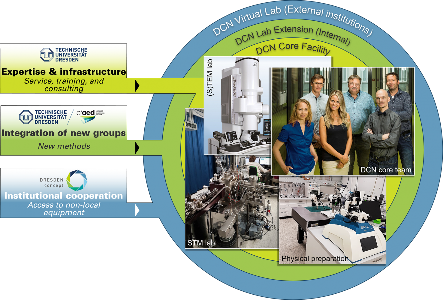The DCN is organized in a three-fold core-shell structure. While the DCN Core Facility run by the DCN Core Team provides for the lab infrastructure, central equipment (incl. maintenance), know-how, user training and device access, it is surrounded in the same building by additional groups from the TU Dresden. These groups share their own equipment with regular DCN users and/or try to interface currently solely internally available techniques to a wider user group – thereby successively expanding DCN’s methodical portfolio within the DCN Lab Extension. The scientific environment of the TU Dresden – in particular the DRESDEN-concept institutes – provide access to additional equipment for (non-local) use outside the campus of TU Dresden, thereby contributing to the DCN Virtual Lab, DCN’s outermost organizational shell.