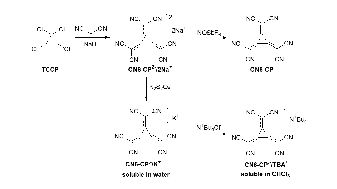 In recent years, we have studied, in close collaboration with the Leibniz Institute for Polymer Research (IPF), novel dopant molecules and their compatibility with a variety of OSCs.[1–5] One class of novel dopants is based on a hexacyano-substituted [3]-radialene. The neutral form of this molecule (CN6-CP) has shown to be a very strong dopant with donor-acceptor copolymers, unfortunately its poor solubility in organic solvents limits possible applications.[1] The solubility limitation can be solved by using the anion-radical of CN6-CP, which dependent on the used cation can be dissolved in water and a wide range of organic solvents. Although the reduction of CN6-CP leads to a lower doping strength it is still able to act as a dopant for a variety of p-type semiconductors, like P3HT.[2,3,5]