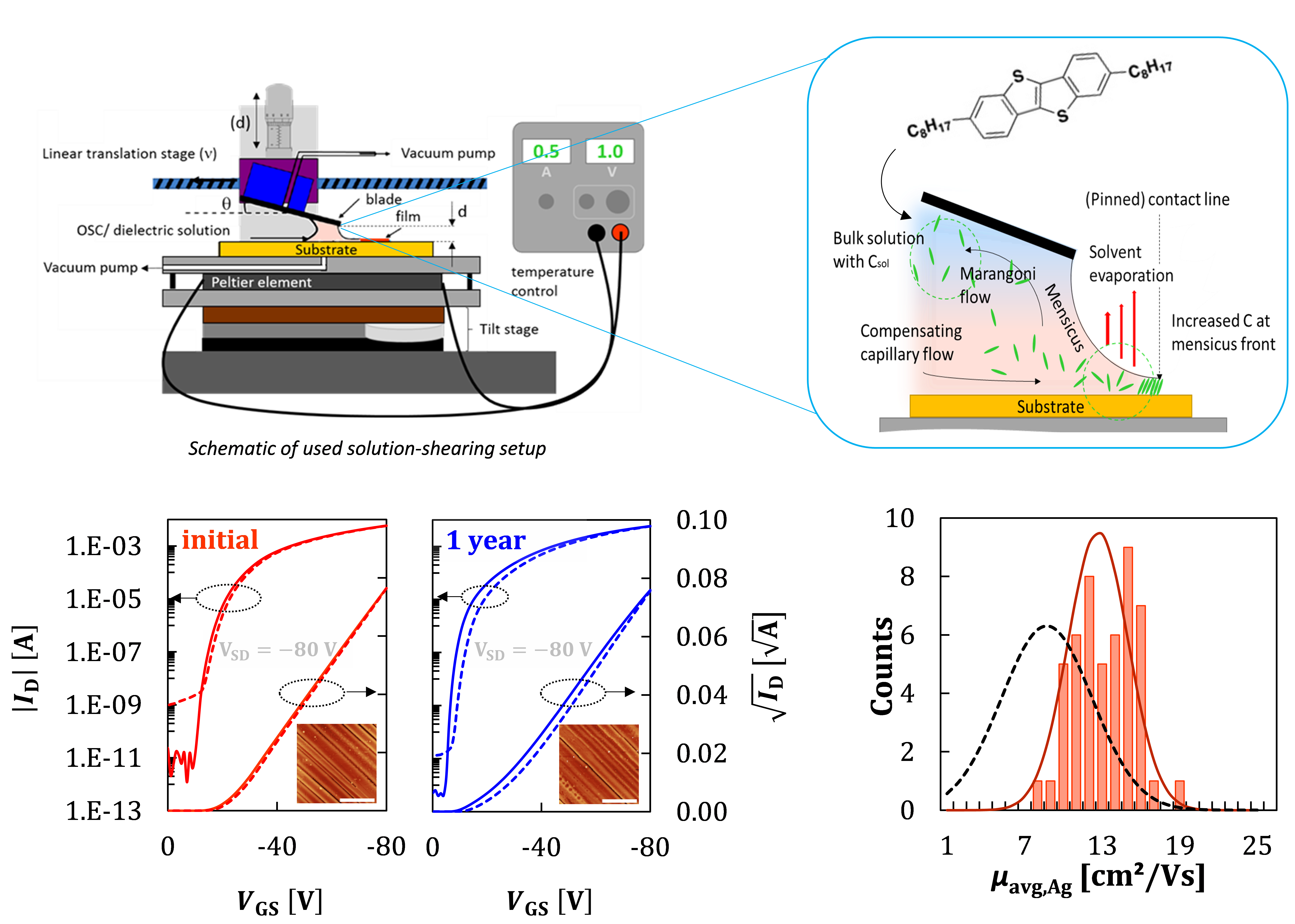 While our “solution shearing” coaters are clearly lab-scale tools that only emulate important properties of larger, industrial-grade coating tools, they allow us to study the effect of the coating conditions and physics in a flexible manner. It is a test-bed to study modifications from piezo crystal-introduced vibrations[7] of the coating blade to roll-to-roll setups that allow as to monitor film growth in-situ[12].