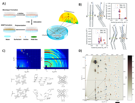 Figure 1 Examples of synchrotron X-ray scattering-based research in our group: A) in-situ synthesis and growth monitoring of layered organic 2D materials in a Langmuir trough. B) Advanced refinement calculations that reconstruct molecular packing from GIWAXS data. B-C) Monitoring and in-situ studies of polymorphism and polymorphic transitions. D) Unit cell reconstruction in multi-phase organic hetero-layer systems