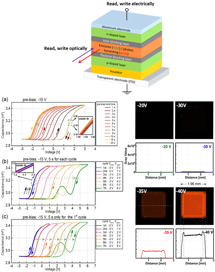 We recently were able to observe a distinct memory window and electrical reading and writing of memory states in OLED structures that contain an additional capacitive element.[1] Due to the fact that the device contains a p-i-n junction, one of the memory states can already also be detected by visible light emission. These results are highly promising – not only due to the simplicity of the device compared to FLASH-type floating gate device structures[2,3] but also due to strong indications for a multibit storage capability and the photonic access to the memory states. We are currently developing this memory to be accessible both fully electrically and independently fully optically, but also explore their uses as memcapacitive elements in neuromorphic organic circuits. |