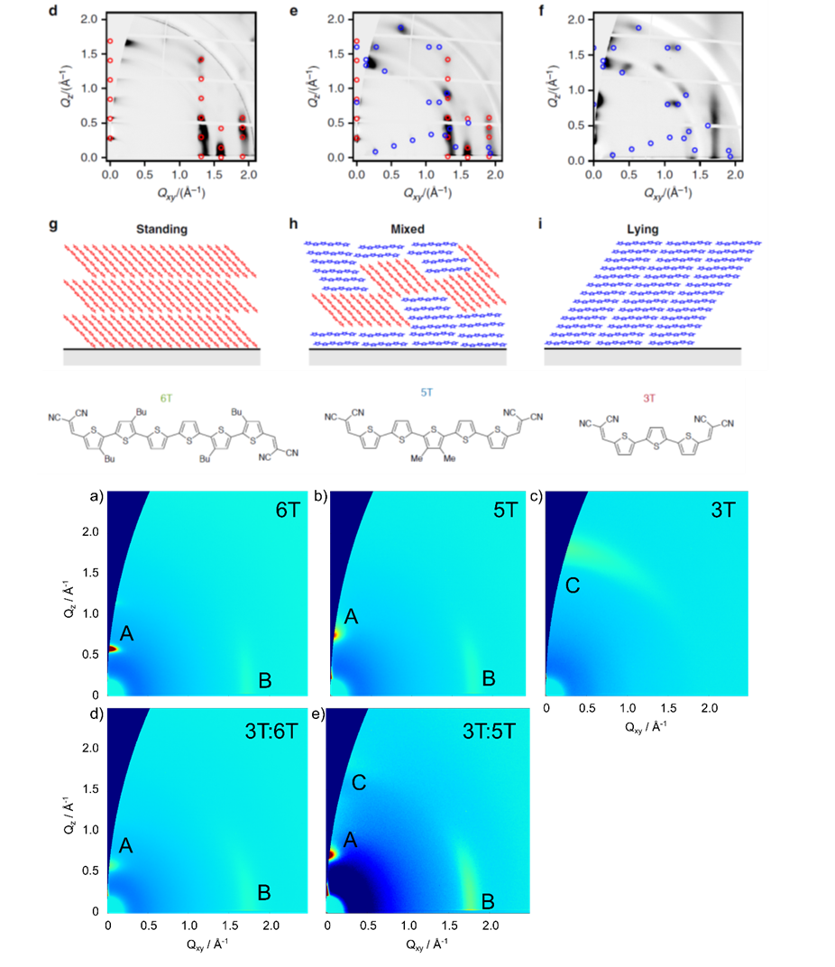 Similarly to the solution processed polymer:fullerene solar cells we also performed structural investigations on solar cells with vacuum deposited small molecules. By employing GIWAXS measurements, we were able to explain the changes in performance of homojunction solar cells using a thiophene-based semiconductor, when using various deposition conditions, by the orientation of the molecules in respect to the substrate (see top panel on the left). The relation between standing and lying molecules in these polycrystalline films defines the rate of charge separation leading to devices with improved conversion efficiency.[5] In a similar vein, we investigated how the blending of oligothiophenes with different numbers of thiophene rings can affect the structure of vacuum-deposited films leading to variations in the energy gap of the semiconductor film (see bottom panel on the left). This effect, similar to inorganic semiconductors allows the tuning of the band gap of organic semiconductors, something that so far has only been possible by changing the molecular structure of the semiconductors themselves.[6]